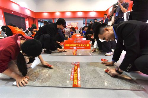 大角鹿展館遵循中國古建筑營造法則,采集經(jīng)典的故宮紅色,融合了簡約而出挑的造型,呈現(xiàn)堂皇端莊、宏偉壯觀的視覺效果。大角鹿本次展會重點展示的柔光磚,獨創(chuàng)“柔光肌膚”國家專利技術,同時運用了“超耐磨鉆石釉”技術,解決了耐磨性和不易清潔的問題,高度迎合了高品質(zhì)家居生活人群的極致追求,吸引眾多領導嘉賓、媒體、消費者、代理商前來參觀,成為晉江陶博會人氣王。 瓷磚好不好,磨磨就知道大角鹿超耐磨萬人pk大賽燃爆晉江