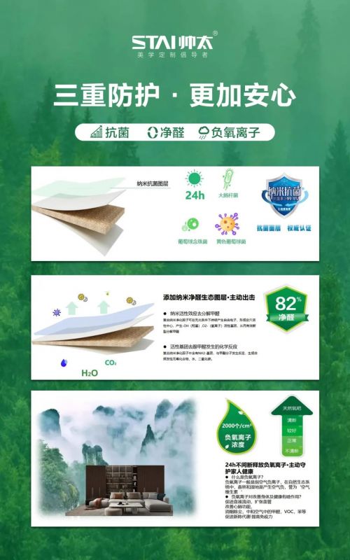 帥太品牌創(chuàng)立21載,對環(huán)保健康始終高度重視,2023年全新推出的凈醛抗菌耐馨板,打響凈醛抗菌保衛(wèi)戰(zhàn)!從環(huán)保、科技、時(shí)尚的研發(fā)理念到健康整家,從單產(chǎn)品環(huán)保到整家環(huán)保的健康維度劇變。 帥太凈醛抗菌耐馨板 引領(lǐng)家居健康革命 帥太品牌在創(chuàng)始之初就以環(huán)保、科技、時(shí)尚的產(chǎn)品研發(fā)理念,2011年帥太櫥柜推出之初,就本著為消費(fèi)者打造綠色健康的產(chǎn)品,率先在櫥柜行業(yè)中推出“抗菌板”,深受消費(fèi)者的熱捧!