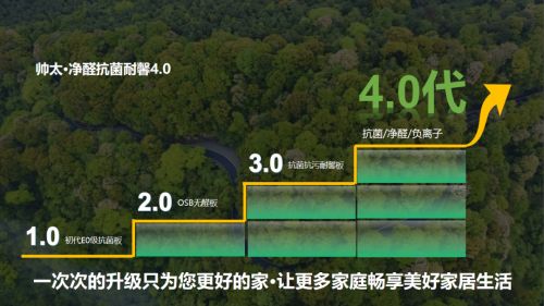 2016年帥太家居致力于好產(chǎn)品首先要健康,同時(shí)隨著消費(fèi)者的對環(huán)保的更高層次的需要,再一次環(huán)保升級,再一次掀起環(huán)保和健康的浪潮。中原家居行業(yè)首批采用OSB原態(tài)板的家居企業(yè),為消費(fèi)者健康再一次保駕護(hù)航。2021年帥太強(qiáng)勢推出耐馨板這是一款和板材源頭廠家聯(lián)合研發(fā)的專利專供產(chǎn)品,蓄勢打磨3年,強(qiáng)勢推出,更加抗污漬,耐劃痕抗刮花5倍,環(huán)保等級達(dá)國標(biāo)ENF。