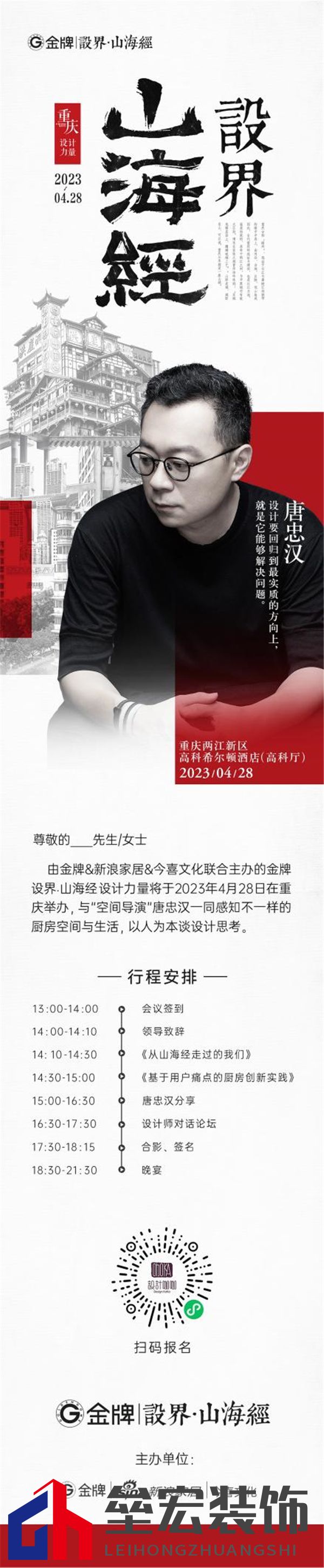 ??唐忠漢 ??近境制作創(chuàng)始人·設(shè)計總監(jiān) ??中國室內(nèi)設(shè)計十大年度人物 ??中國空間陳設(shè)行業(yè)領(lǐng)軍人物 ??安邸AD100中國最具影響力100位設(shè)計精英 ??Andrew Martin國際設(shè)計大獎得主 ??意大利A‘ design鉑金獎得主 ??北京清華大學(xué)軟裝研修班講師 ??深圳市創(chuàng)想公益基金會專家顧問 ??2023年4月28日,唐忠漢將重磅蒞臨金牌《設(shè)界·山海經(jīng)》設(shè)計力量的重慶活動現(xiàn)場,帶來主題分享,與新銳設(shè)計力量現(xiàn)場解讀其設(shè)計實踐中的美學(xué)邏輯,探尋如何打造高品質(zhì)的理想居住空間! ??與此同時,《設(shè)界·山海經(jīng)》重慶活動還將精彩上演多重環(huán)節(jié),設(shè)界·山海經(jīng)發(fā)起人、金牌廚柜品牌總監(jiān)劉興奮先生應(yīng)邀發(fā)表《從山海經(jīng)走過的我們》主題講話,金牌廚柜研發(fā)總監(jiān)助理周耘先生帶來《基于用戶痛點的廚房創(chuàng)新實踐》的新品分享,講述金牌的品牌文化與設(shè)計理念。而在設(shè)計師對話論壇,《設(shè)界·山海經(jīng)》活動將與新設(shè)計青年強強對話,從文化、美學(xué)、產(chǎn)品工業(yè)等多個維度,討論新趨勢、新審美、新思潮,設(shè)計如何讓生活更美好,更貼近生活以及如何同時具有美學(xué)價值。