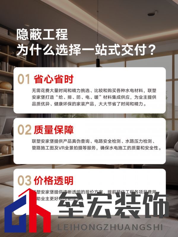 ??同時,聯(lián)塑安家堡從售前 - 售中 - 售后提供全方位五星服務(wù)。在前期規(guī)劃階段,專業(yè)團隊會根據(jù)業(yè)主需求,制定最適合的方案,規(guī)劃核心點就是選對服務(wù)團隊,而聯(lián)塑無疑是最佳選擇。聯(lián)塑憑借多年的行業(yè)經(jīng)驗,對隱蔽工程有著深刻的理解,能夠精準(zhǔn)把握業(yè)主需求。在施工過程中,嚴(yán)格按照標(biāo)準(zhǔn)執(zhí)行,切實解決各種家裝隱蔽工程難題。即使在售后,若出現(xiàn)任何問題,聯(lián)塑的專業(yè)售后團隊也會及時響應(yīng),迅速處理。這種全方位的服務(wù),讓家裝實現(xiàn)省時、省心、省力,真正做到讓業(yè)主無憂。